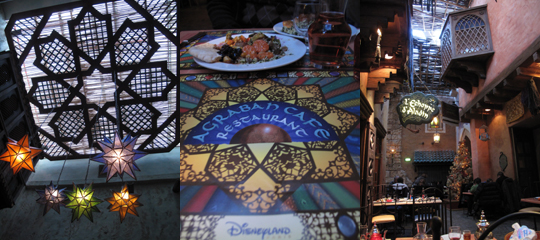 Our other meals were in settings which were just as psychedelic. We had dinner at the Blue Lagoon – a Carribean Seafood Restaurant themed around the Pirates of the Caribbean. Jerk seafood, salt fish croquettes, deep-fried Mahi-Mahi and Grilled King Prawns were amongst the fare on offer. In fact, the restaurant itself is on the set of the park’s boat ride, inevitably leading to the shouts of “Bon Appetit” from the many French youths passing by. Food though was pretty mediocre and nothing to shout about. Our final lunch stop before coming home was at the intricately decorated Agrabah, which as you would expect from the set of Aladdin had a Middle-East and Mediterranean-themed buffet to match its Bazaar-like interior. The unlimited chicken tagine, taboulleh and shwarma meats were all very decent – good value for the 20 EUR per head cost.