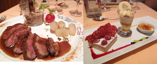 Ginger-bread flavoured Duck Breast with Glazed Turnips and Chestnut Puree (left), Raspberry Parfait, Passionfruit Coulis and Creme Brulee (Right)