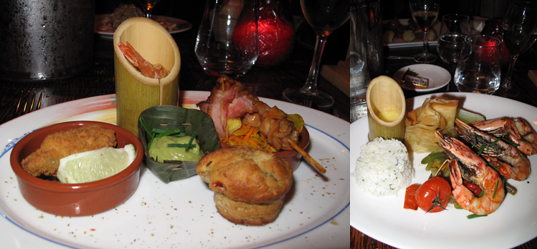 Carribean Starter selection (left) and Grilled Prawns and Deep-fried Mahi-Mahi with Coconut rice (right)