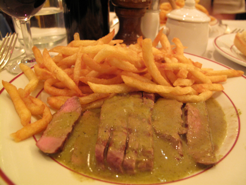 The Steak Frites at L’Entrecote is the stuff of legends. The story goes that almost half a century ago, a certain gentleman by the name of Paul Gineste de Saurs took over the reigns of an Italian restaurant in Paris’ 17th arrondissement. Although De Saurs’ intention was to serve French Bistro food, he kept pretty much everything else about the former establishment intact, from it’s Italian name-sake to the characteristic Venetian decor. Only one other addition was made – a simple “L’Entrecote” sign was posted outside, to indicate to passer-bys that steak frites was the only choice on offer.