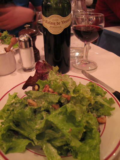 Warning: If you don’t eat steak for some reason or rather, I’d suggest turning around and heading home as they simply don’t serve anything else here. They don’t do reservations either… So if you manage to survive the ridiculously long queue which took us just under an hour to navigate last Saturday Night, all there is left to do is to choose how you want your steak done and decide what you want to drink (they sport their very own label of Bordeaux). Everything else is decided for you. Everyone starts with a simple salad of Lettuce and Walnuts. The leaves were a little soggy from over-dressing if you ask me, but the zingy, tangy mustard vinaigrette did the job of getting the salivary glands flowing for the main event….