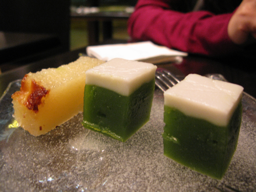 We rounded up the meal with some Malaysian Kuih, a general term used to describe a variety of traditional, bite-sized sweet “cakes” which are usually served at the end of a savoury meal. The two pictured below are Kuih Talam (a green, pandan-leaf flavoured paste with a white topping of rich coconut cream) and Kuih Bengka (a sweet. sticky, tapioca and custard based cake).