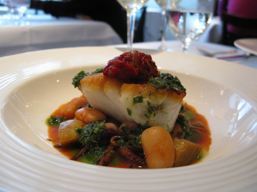Roast Cod with Grilled Baby Squid, Baby Artichokes, Piquillo Peppers and Salsa Verde