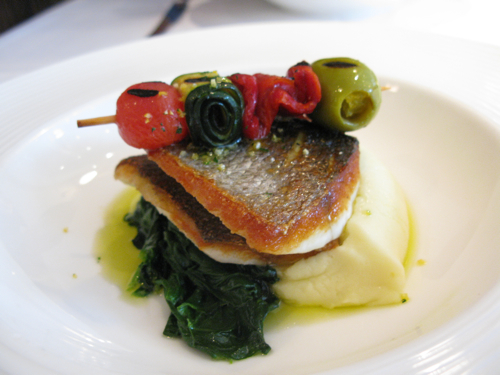 Crisp fillet of Seabass with Olive Oil Mash, Provencale Brochette and Gremolata