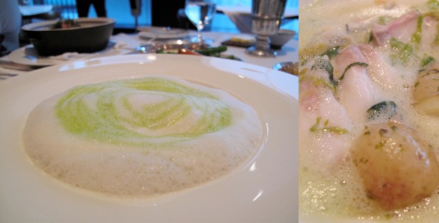 Roasted Cornish Hake, Razor Clam and Cockle foam, English Pea and lettuce, potatoes in seaweed