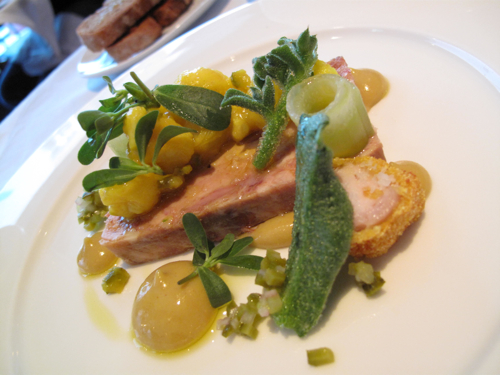 Pressed tete de porc, rabbit and foie gras, piccalilli and mustard gel