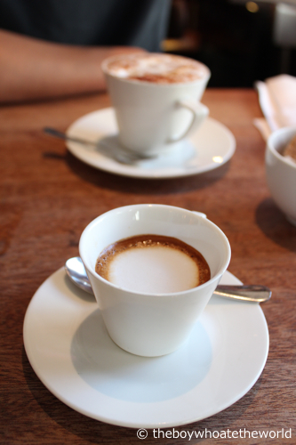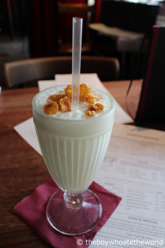 When it comes to guilty weekend food pleasures, there are few things that can top Hawksmoor’s Big Breakfast. Thick-cut Bacon chops… rich, melt in the mouth bone marrow… meaty sausages… black pudding… roast tomatoes… portobello mushrooms… eggs sunny side-up… hash… and unlimited sourdough toast (dipped in lovely beef dripping). It’s really quite big (‘for 2 to share’ it says, but easily shared amongst 3 if you ask me) and carnivorously glorious. Add to that a good, strong cuppa coffee with their ingenious Cornflake milkshake and what you have is a very happy recipe for the perfect brunch.