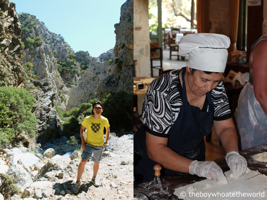 Climbing the Rouvas Gorge (left), Cretan cheese pie making with Mrs Koula (right)