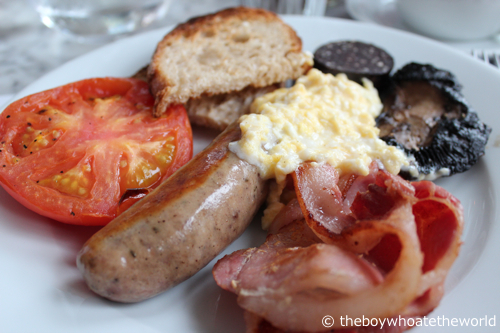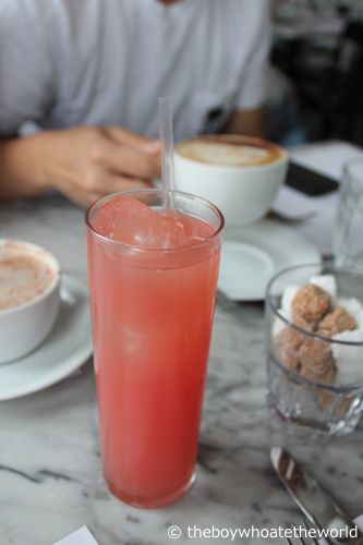 Apart from their pancakes which were disappointingly stodgy and undercooked (ugh..), most of the staple brunch dishes were generally alright. Sausages were large and meaty… Bacon, nicely-browned with crisped-up fat on the edges just how I like ’em… and a wonderfully refreshing pink-grapefruit juice with just the right balance of sweet vs tang.