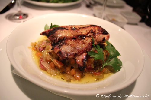 The flavours at EB are big, gutsy yet sophisticated. Take their exceptional char-grilled Quail starter for instance. Marinated in Madeira, the surface of the quail had a delectably sweet yet smoky char which complement the well-seasoned, juicy quail meat beautifully. A delicious dish, that was made even better with the very comforting sofrito of carrots, celery and onions it was served on top of.