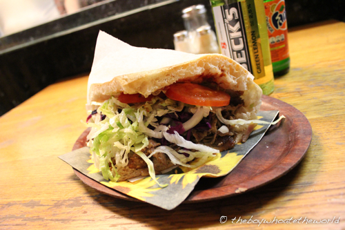 Toasty warm turkish flat bread (crisp on the outside, still fluffly on the inside)… crunchy lettuce… juicy tomatoes… spicy-but-not-too-raw red onion… tender, melt-in the mouth Veal Kebab meat… and lashings of their home-made garlic sauce and sweet, harissa-style chilli sauce. It’s quite simply the happiest €2.90 I’ve ever spent in the eurozone. The ultimate austerity food.