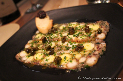 Octopus Carpaccio with capers, black olives and saffron vinaigrette (£11.50)