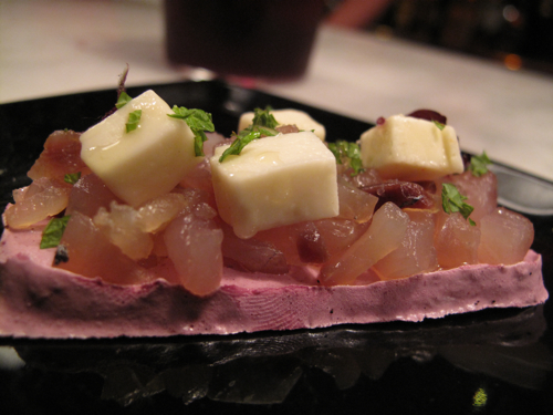 Potato Bread with Brown & Black pudding Butter, Crispy Bacon and Chicken Skin (@ Viajante)