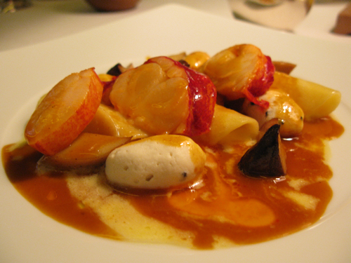 “Sauté gourmand” of Lobster, truffled chicken quenelles, pasta (@ Alain Ducasse, The Dorchester)