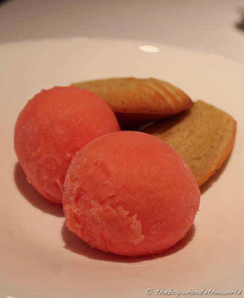 Suckers for anything with Blood orange on a menu, the better half and I broke from tradition and opted for the same dessert course. I thought the powerful shot of Gin in the dish worked wonders with the sweet, sharp and mildly bitter kick of the Blood Orange sorbet. The Madeleines were pretty fabulous as well… deliciously buttery and served toasty warm, it was a real treat and a fresh, clean end to a quite superb meal.