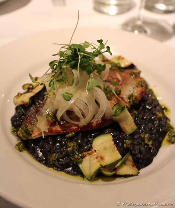 Bream with Grilled Courgettes, Risotto Nero, shaved Fennel and Citrus Dressing