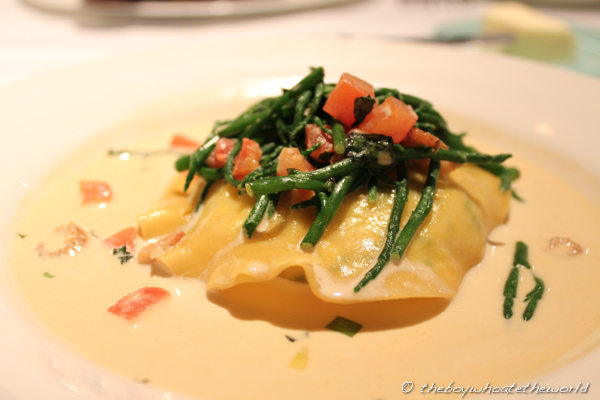 Crab Raviolo with Samphire, Brown Shrimp and Fondue of Leeks and Bisque Sauce