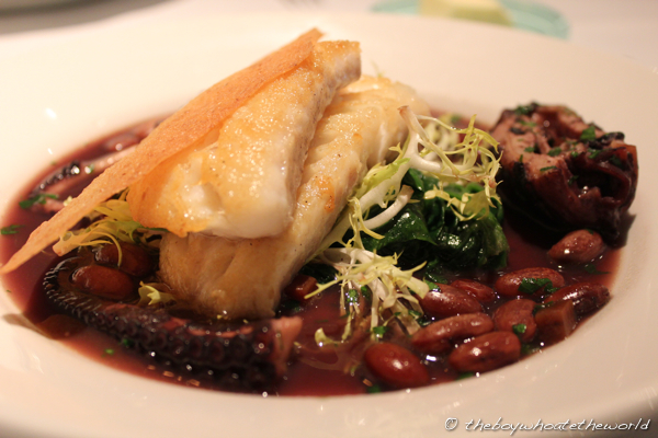 Red Wine Braised Octopus with Roast Cod, crisp Indian Pastry and Borlotti Beans