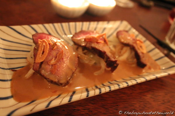 Then came the Beef Tataki – beautifully prime slices of cow served with a nutty, creamy sesame sauce. The bed of sauteed onions they were served on were a wee bit raw for my liking, but the meat was cooked perfectly to a wonderfully tender medium rare. What made the dish for me though was the aromatic crunch of the deep fried garlic slivers sprinkled on top. Yum-meh bits of gold.