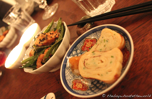 (L) French Beans with Japanese fish-cakes, (R) Tamago Omelette