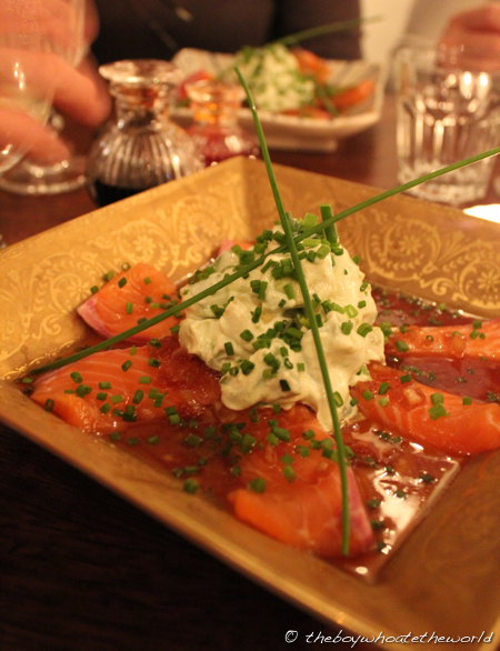 Salmon Sashimi with a Japanese Vinaigrette, creme fraiche, avocado and chives
