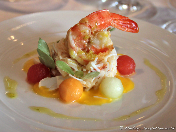 Flaked Devon crab with melon and fresh almonds with marinated prawn