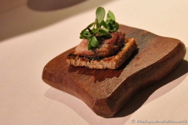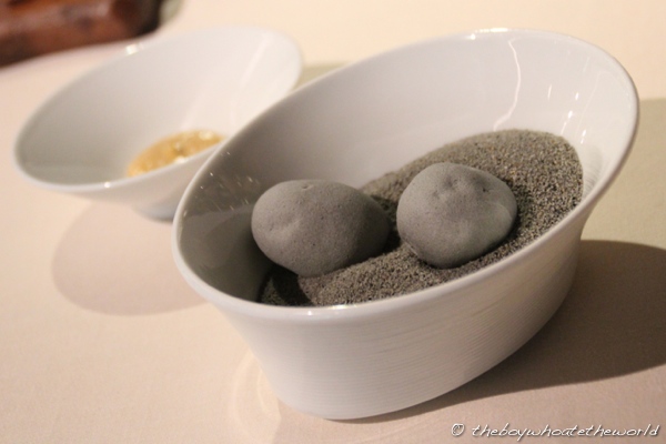First up were five bite-sized amuse bouches that were served to our table in quick succession. With the table still devoid of cutlery, we were advised to eat these using our hands. ‘Kraft paper’ topped with fancy sounding ‘marine accents’ (2) was nothing more than a crisp wafer topped with some fresh crab. Even more underwhelming was the little speck of fried ‘fishbones’ (3), served rustically on a chunk of hot rock – a single deep-fried anchovy would have done the job better. ‘Edible stones’ (4), though visually uncanny, was at the end of the day boiled potatoes wrapped in a shell of edible clay. At least the garlic mayo beside it was awesome.