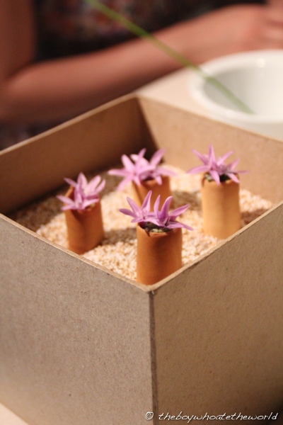 There was a silver lining though, and it came in the form of some crispy woodwind wafers sticking out of a square sandbox (6). As you pulled the woodwinds out, they began to extend out of the sand, as if my magic until they were the length of a full cigar. Filled with crunchy fruits, sea anemone and topped with the most delicate of edible violet flowers, it was a fascinating combination of flavours and textures that sang of the sea, the orchard and the meadows.