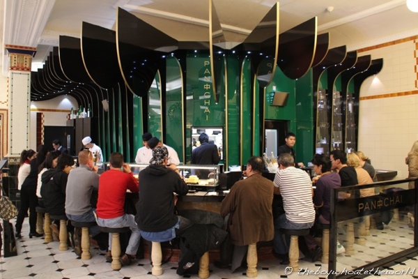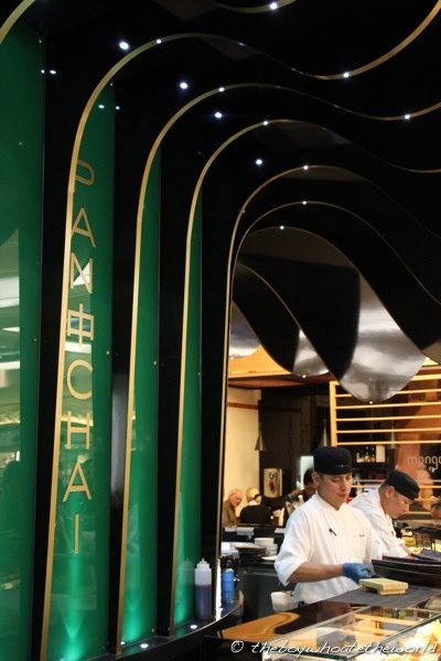 Of all the eateries at Harrods, Pan Chai’s ultra-contemporary food bar is easily the most striking. A glossy wave-like awning wraps around the restaurant’s kitchen… black curves juxtaposed against a stunning jade green and gold backdrop. Despite it being the middle of the week, they had a buzzing lunchtime trade going for them… almost every seat at the bar was filled with well-heeled shoppers and passer-bys tucking into dishes being prepared in real time by the team of chefs behind the counter.