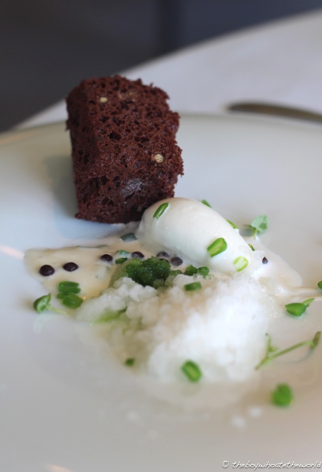 Smoked Cocoa Sponge, Frozen Whisky Cream, Green beans & Mint