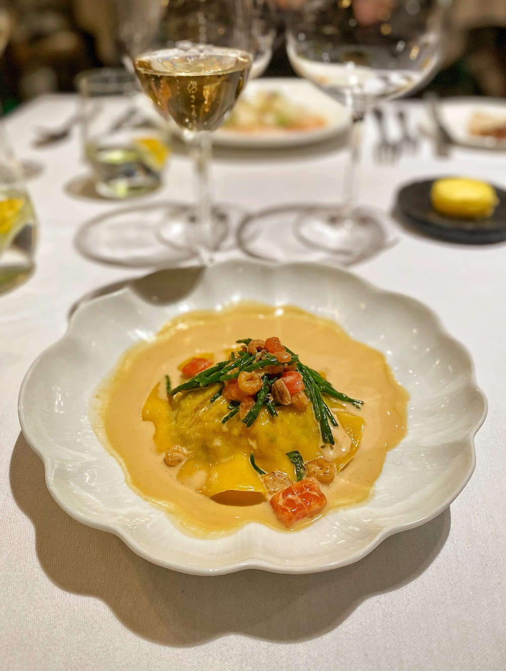 Crab Raviolo with Brown Shrimp, Samphire, & Bisque (@ Medlar – London)